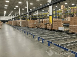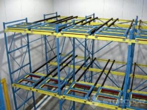 A Pallet Flow or “first in first out” (FIFO) system is another option for high-density pallet storage. Pallets rest on inclined flow rails, and move toward the front of the system as one is removed. A Pallet Flow System is excellent for inventory control, and can be constructed from roll form or structural pallet rack.